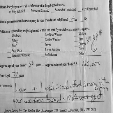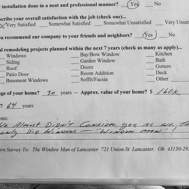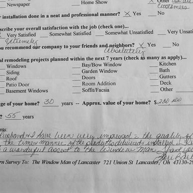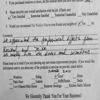 A 2" binder full of post-installation questionnaires completed and returned to us by our customers. Read what they thought about our company, installation crew, craftmanship and products after we completed their home improvement projects.