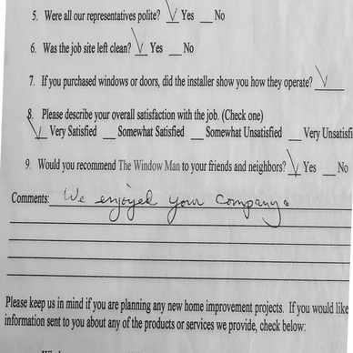 "My husband and I have been very impressed with the quality of the products, timed manner of the product delivery and installed. Finally, Steve is a wonderful asset to The Window Man. Thank you, again."