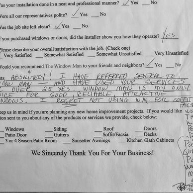 "Absolutely [would recommend]! I have referred several to The Window Man and have used your services for over 25 years. Window Man is my only choice for good, reliable, attractive windows. I REGRET not using W.M for soffit/fascia work that was recently done - Poor quality, Poor workmanship, messy site & took too long."